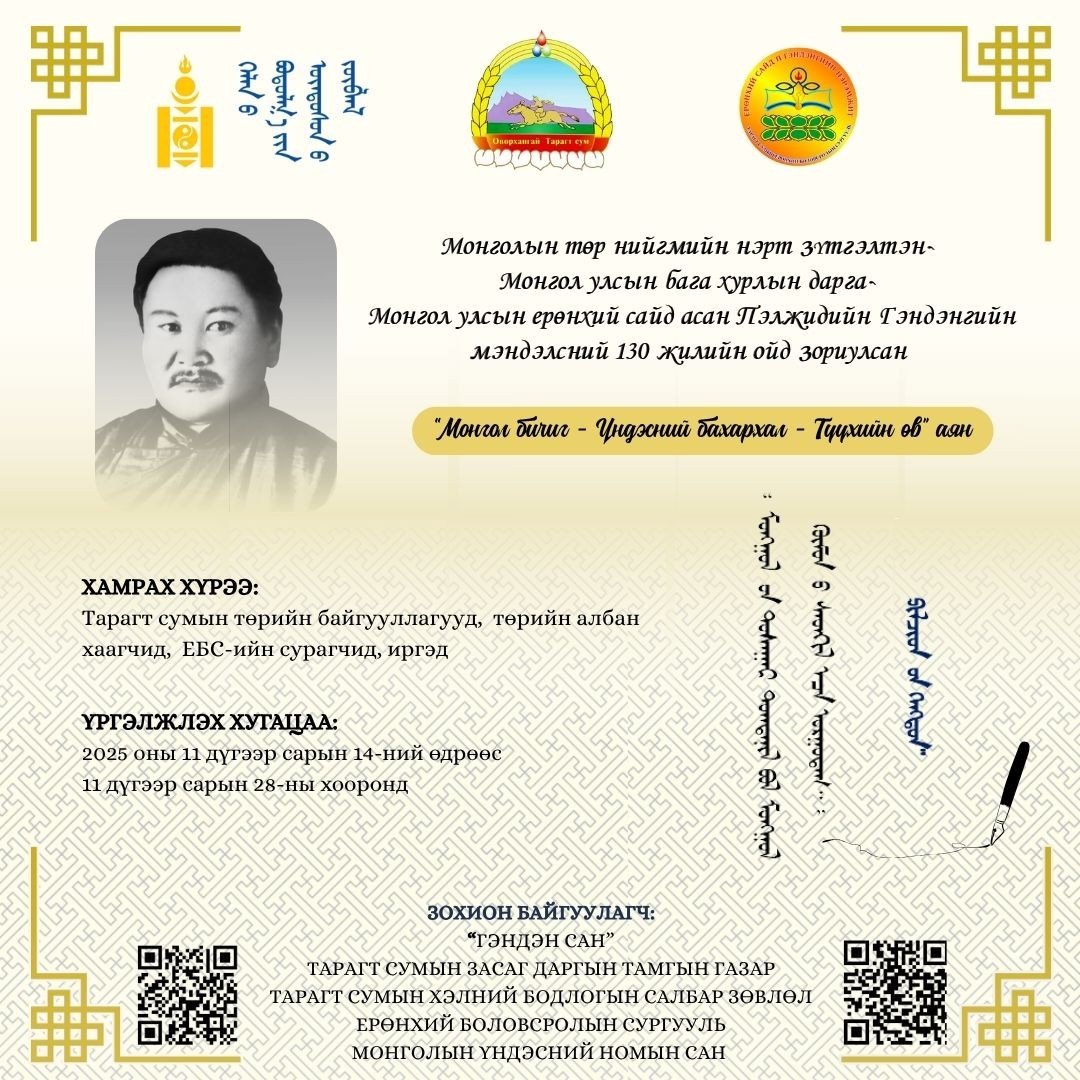 Монголын төр нийгмийн нэрт зүтгэлтэн, Монгол Улсын ес дэх Ерөнхий сайд Пэлжидийн Гэндэнгийн мэндэлсний 130 жилийн ойн арга хэмжээний хүрээнд Пэлжидийн Гэндэнгийн нэрэмжит Тарагт сумын ЕБСургуулийн 2024-2025 оны хичээлийн жилд ЭЕШалгалтаар хамгийн өндөр оноо авсан Даваагийн Дэмчиг, Бат-Эрдэнийн Одсэргарав нарт "ГЭНДЭН САН"-гийн нэрэмжит тэтгэлэг 500,000 төгрөгийг тус тус гардуулан өглөө.